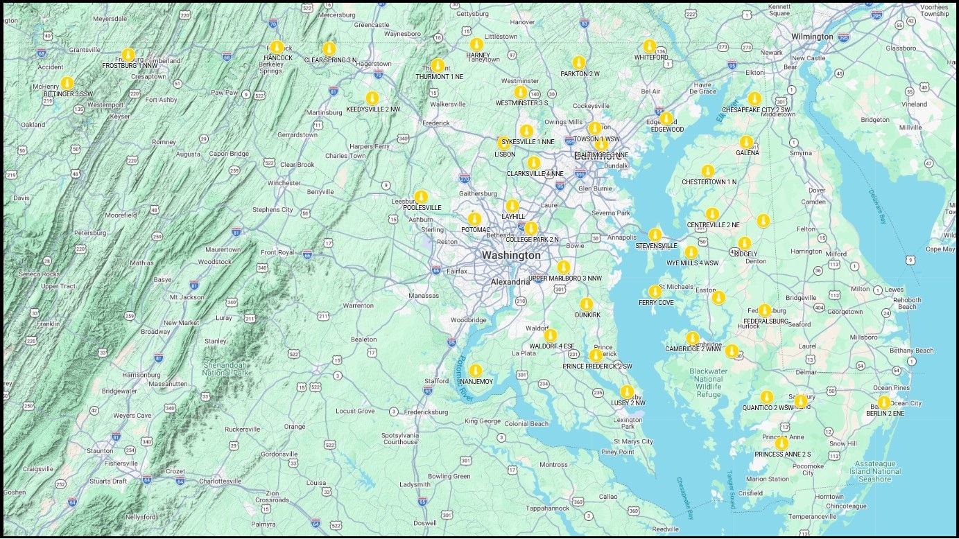 NOTE: The weblinks to these stations are sourced from the National Weather Service’s Time Series Viewer pages for data covering the past 72 hours. For the new stations that portray “coming soon” it might require a bit of time for the data to be ingested and updated on that viewer. In order to access these newer stations’ data more quickly, short-term data might already be available directly from the Maryland Mesonet website in a different format here: Mesonet Home